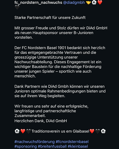Als regionaler Unternehmen unterstüzen wir aktiv den Nachwuchs im Fussball und sind stolzer Sponsor der B-Junioren des FC Nordstern Basel 1901